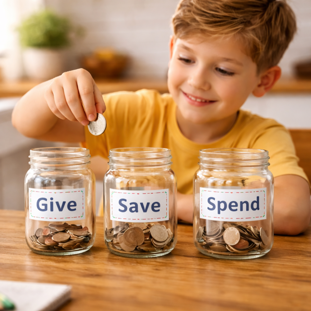 Through the “3 Jars” system, kids practice giving, saving, and spending with intention — learning that money follows wisdom and purpose.